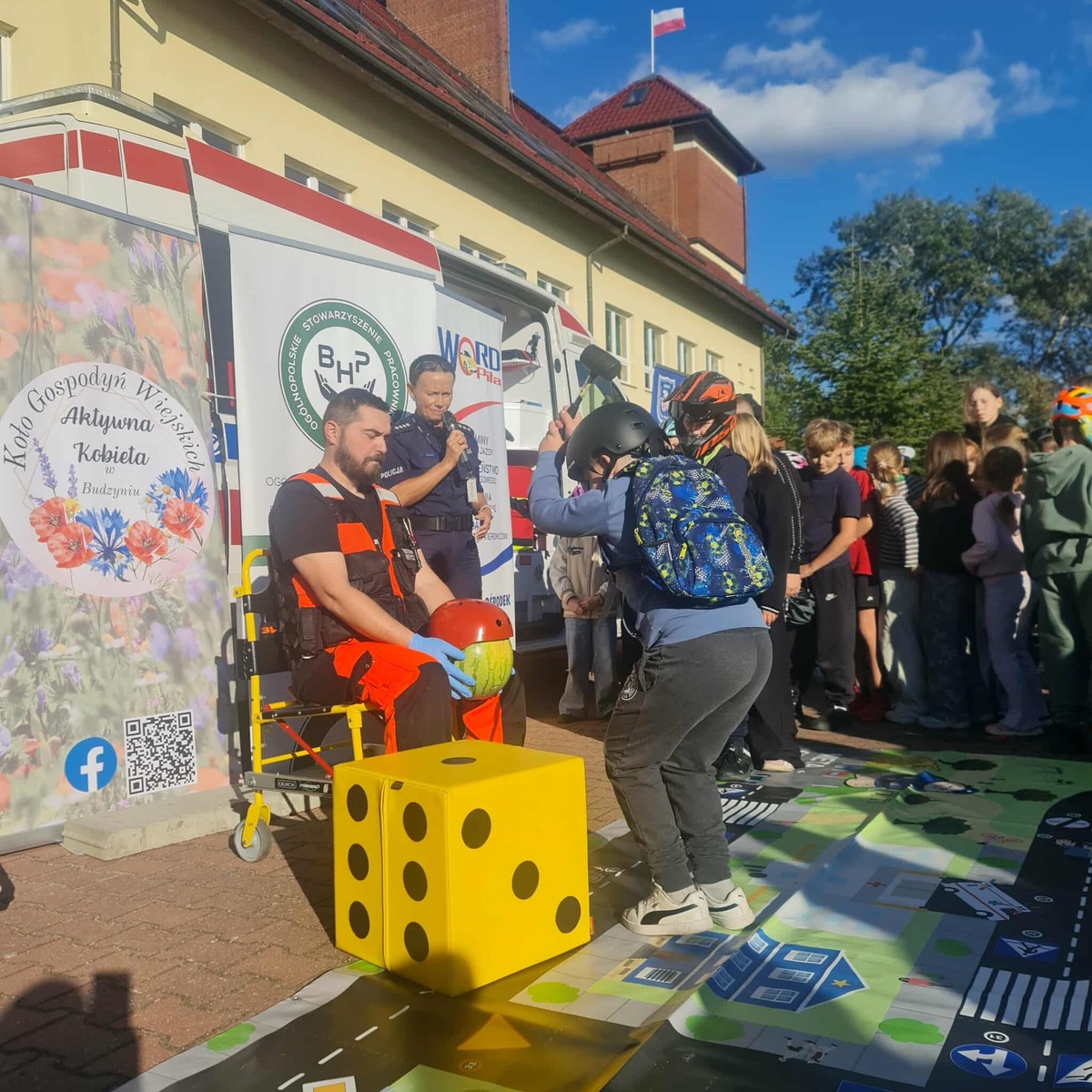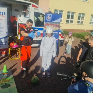 Specjalista z zakresu ratownictwa medycznego omówił rodzaje urazów spowodowanych wypadkiem na hulajnogach. Ogromnym zainteresowaniem wszystkich uczestników akcji cieszyło się doświadczenie z arbuzem w kasku. Pan Stanisław Jarosz zaprezentował w ten sposób, jak ważną rolę odgrywa kask ochronny.