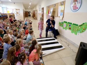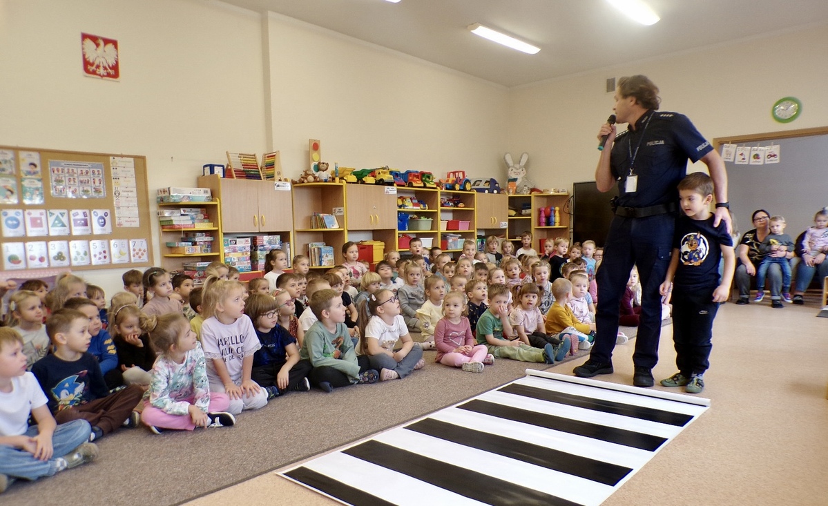 Podczas zajęć funkcjonariusz opowiedział przedszkolakom, na czym polega jego praca, zaprezentował elementy umundurowania i wyposażenia oraz w ciekawy sposób omówił zasady bezpiecznego poruszania się po drodze. Dzieci dowiedziały się, jak prawidłowo przechodzić przez przejście dla pieszych, dlaczego należy nosić odblaski oraz jak reagować w kontaktach z osobami nieznajomymi.