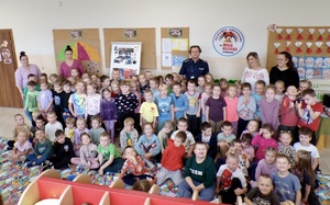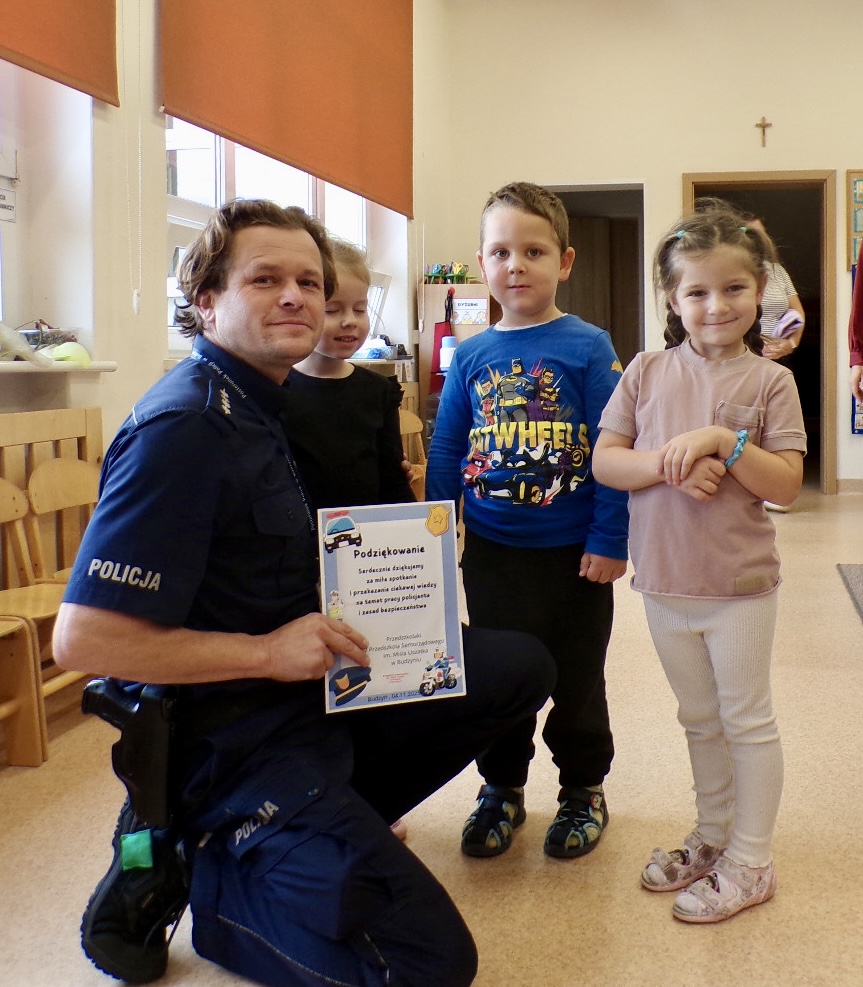 W trosce o bezpieczeństwo najmłodszych asp. sztab. Mariusz Świętek z Posterunku Policji w Budzyniu odwiedził dzieci z Przedszkola Samorządowego im. Misia Uszatka w Budzyniu. Spotkanie miało na celu przybliżenie dzieciom zasad bezpiecznego zachowania w codziennych sytuacjach oraz zapoznanie ich z pracą policjanta.