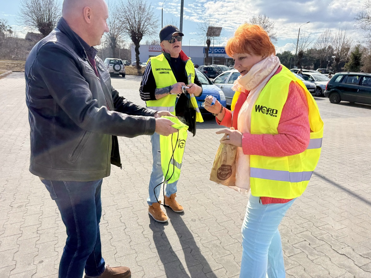 Policjanci WRD KPP w Chodzieży wraz z st. specjalistą ds. bezpieczeństwa WORD w Pile w dniu 21.03.2026 r. rozdają kamizelki odblaskowe mieszkańcom Szamocina